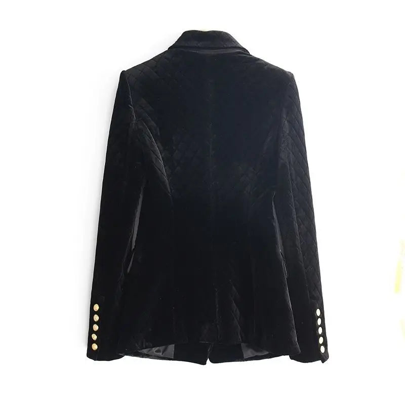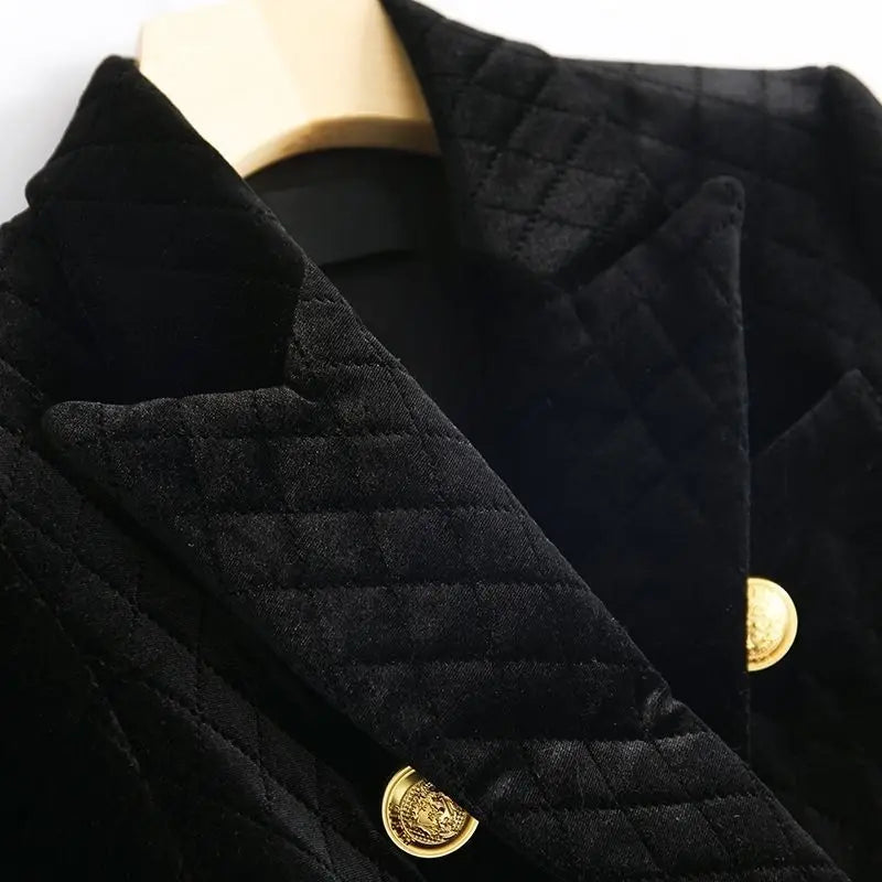 Regular price $128.99Polished, powerful, and effortlessly refined, this black velvet double-breasted blazer is designed to elevate your wardrobe with timeless sophistication. Featuring a structured silhouette and gold-tone metal buttons, this tailored jacket blends classic tailoring with modern femininity.