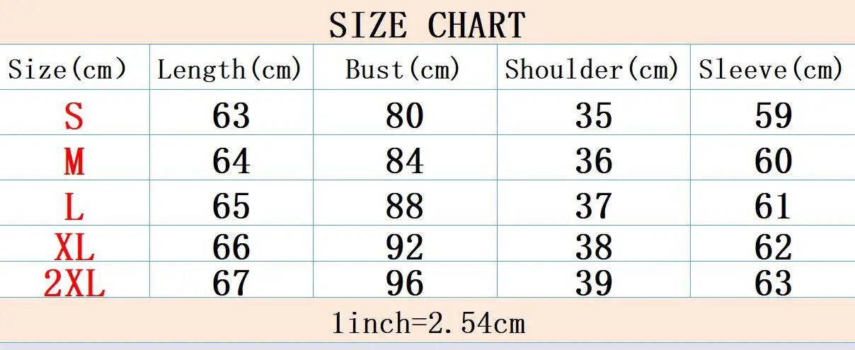 | Size | US Size | Shoulder Width | Bust Size | Length | Sleeve Length |
