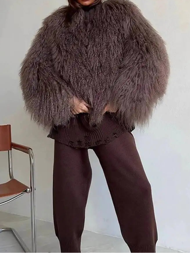 Person wearing a fluffy brown sweater and pants in a minimalistic setting