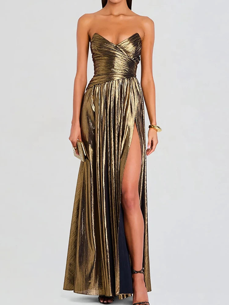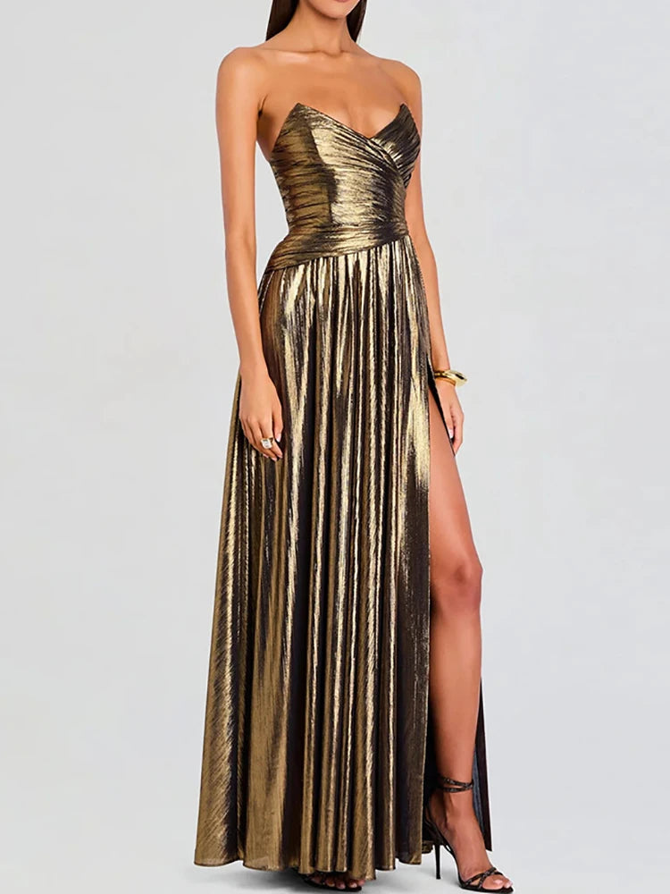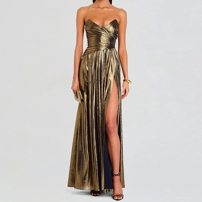 Strapless Metallic Maxi Dress | Elegant High-Slit Evening Gown