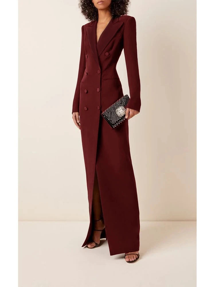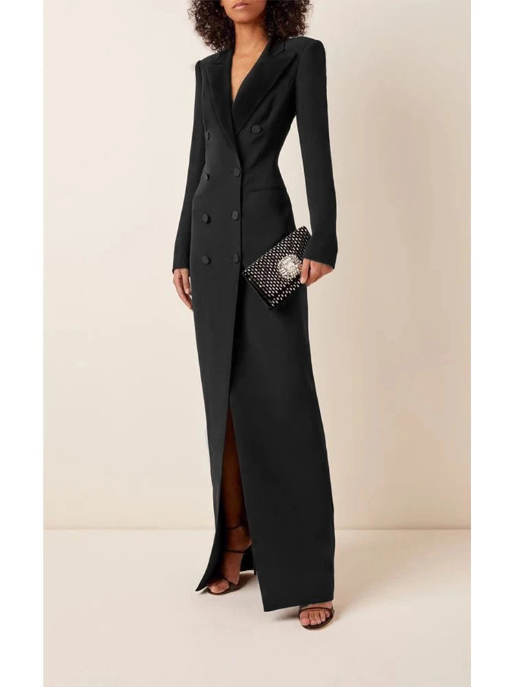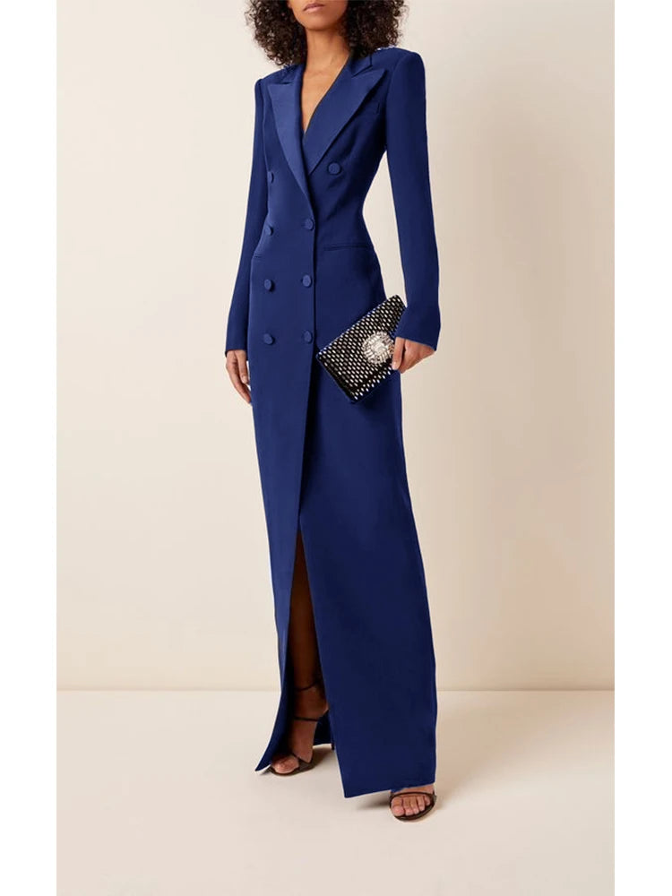 Step into your power in The Royal Authority Coat Dress, a masterclass in structure, grace, and unapologetic sophistication. Designed in a deep royal blue hue, this double-breasted silhouette features a tailored peak lapel and a slim, floor-length fit that elongates the frame beautifully.