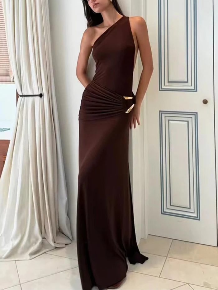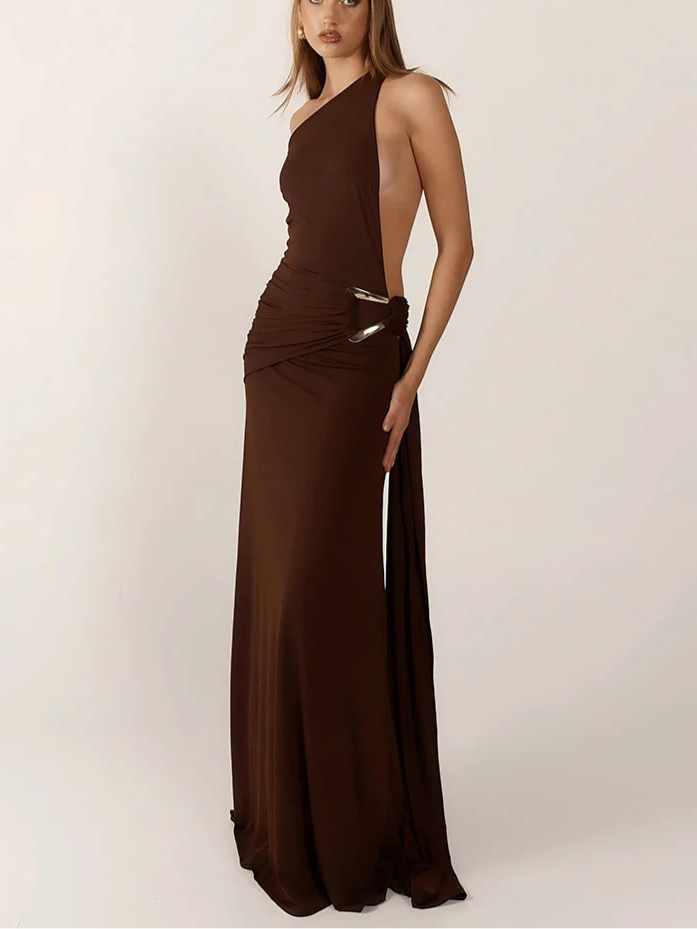 Designed for the woman who owns her presence, the Sienna One-Shoulder Buckle Gown blends clean lines with contemporary edge. The asymmetric neckline and open-back design exude understated confidence, while the metal buckle detailing adds a luxe, sculptural touch. The draped silhouette flatters from every angle, making this a standout choice for black-tie events, formal dinners, and modern soirées.