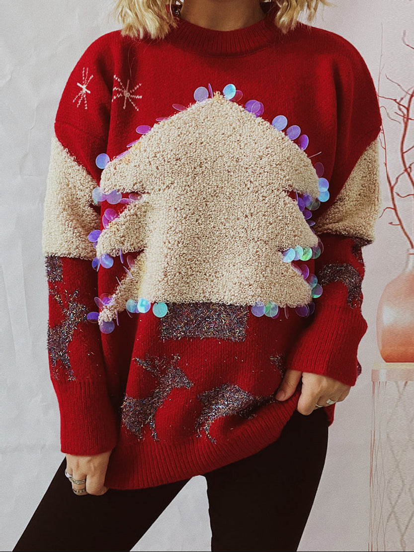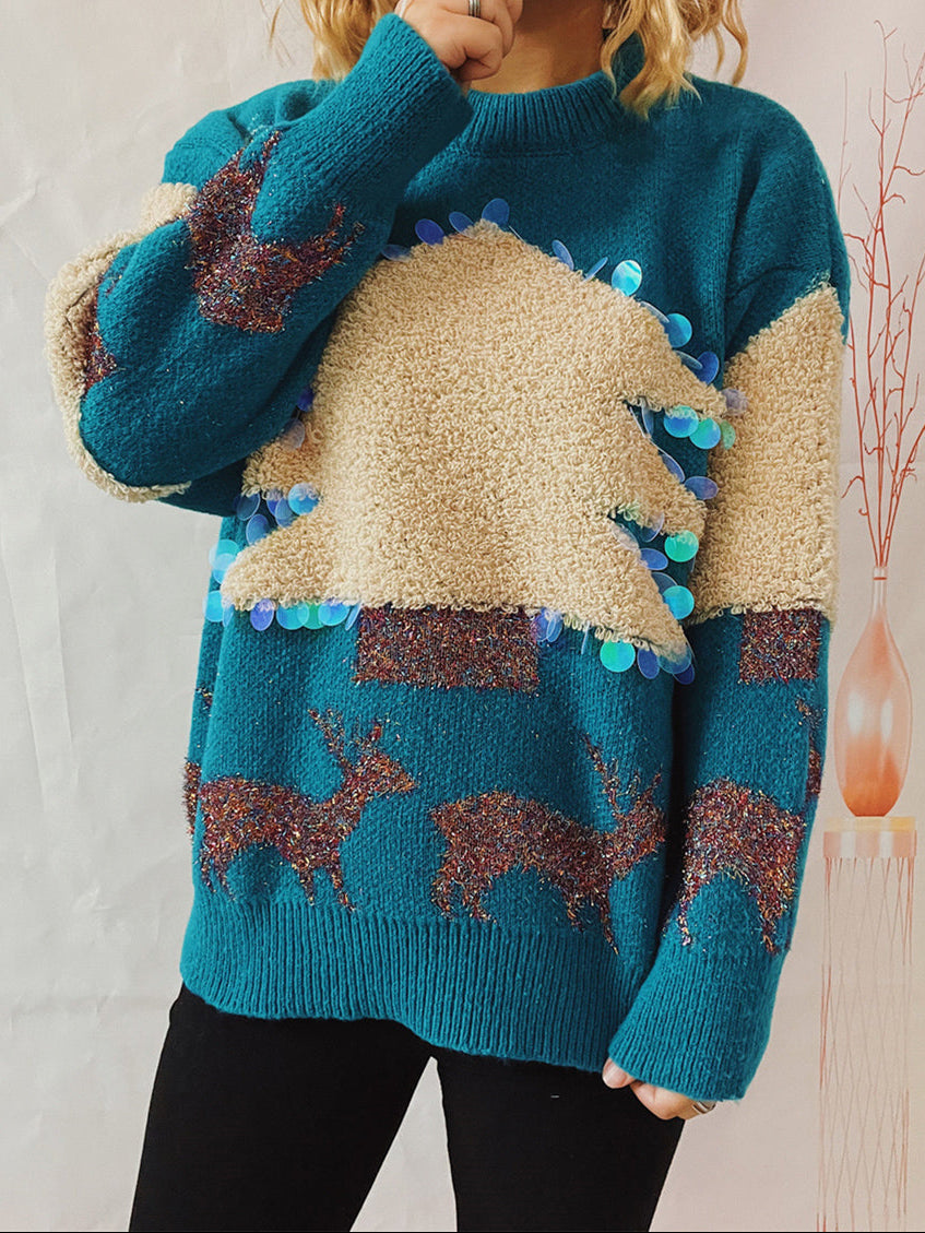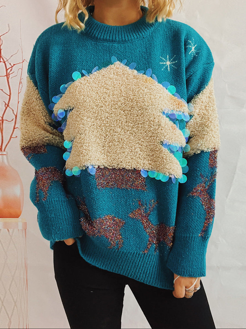 Sequin Christmas Tree & Reindeer Round Neck Sweater