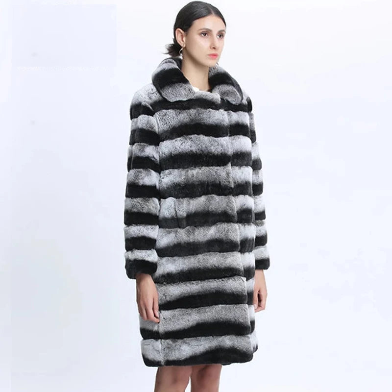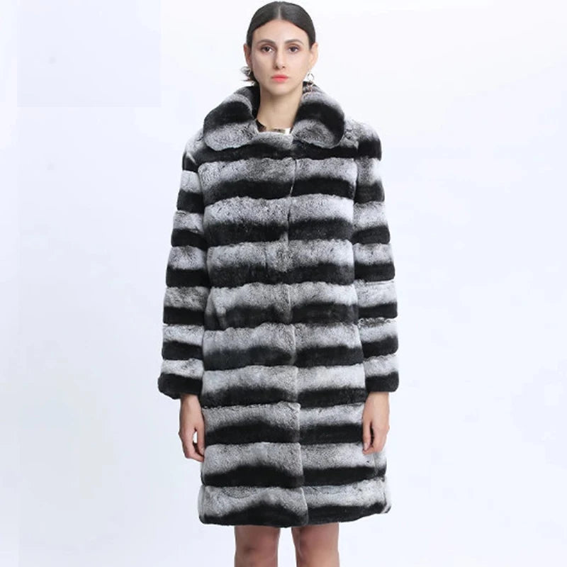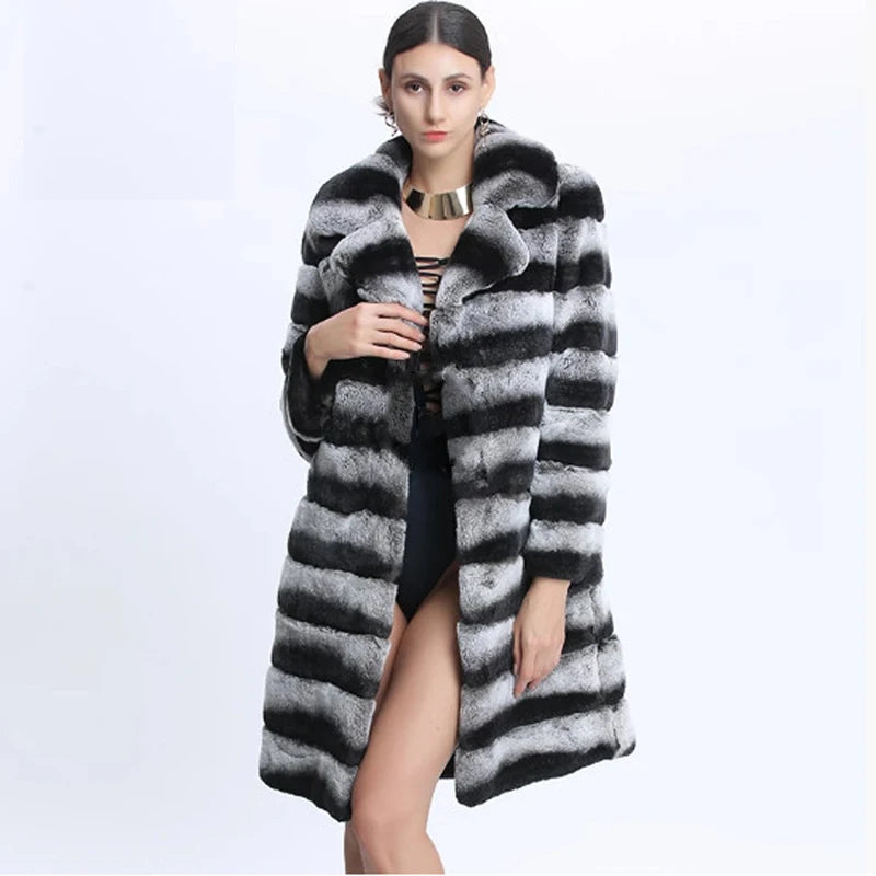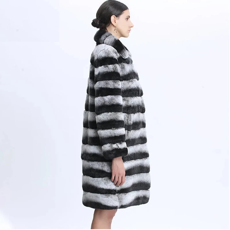 The Silver Reign Faux-Mink Coat blends refined confidence with winter-ready warmth. Crafted in soft faux-mink fur with horizontal striping, it gives the illusion of texture and movement, making every step feel poised and intentional. Its long, slim silhouette flatters petite frames, while the turn-down collar and plush finish add timeless sophistication.